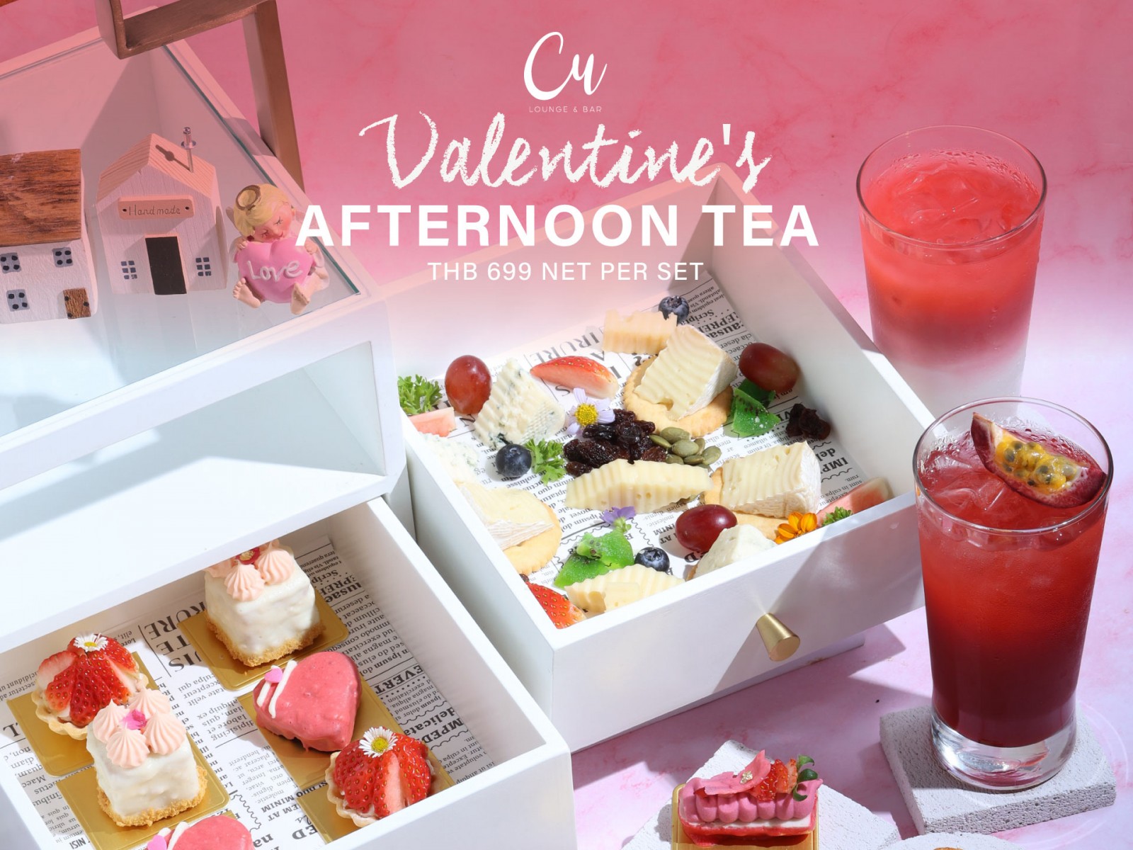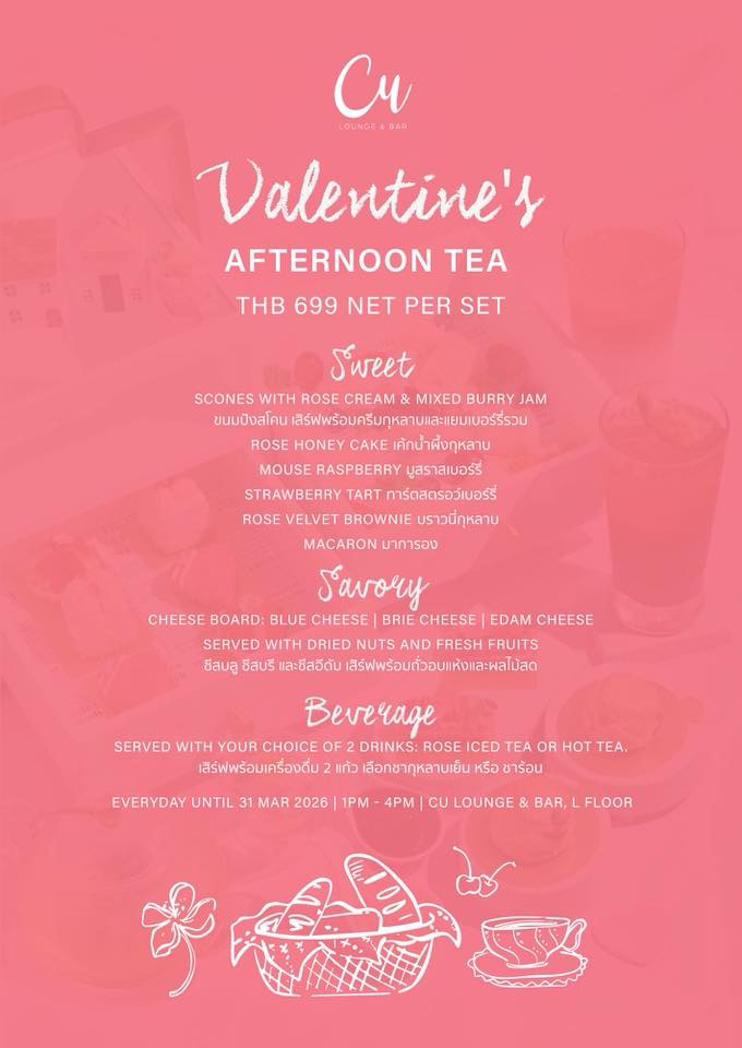 Transform your afternoon into a valentine's celebration at our sophisticated CU Lounge. Indulge in our romantic afternoon tea set featuring seasonal pastries and savories, selection of teas and coffee
