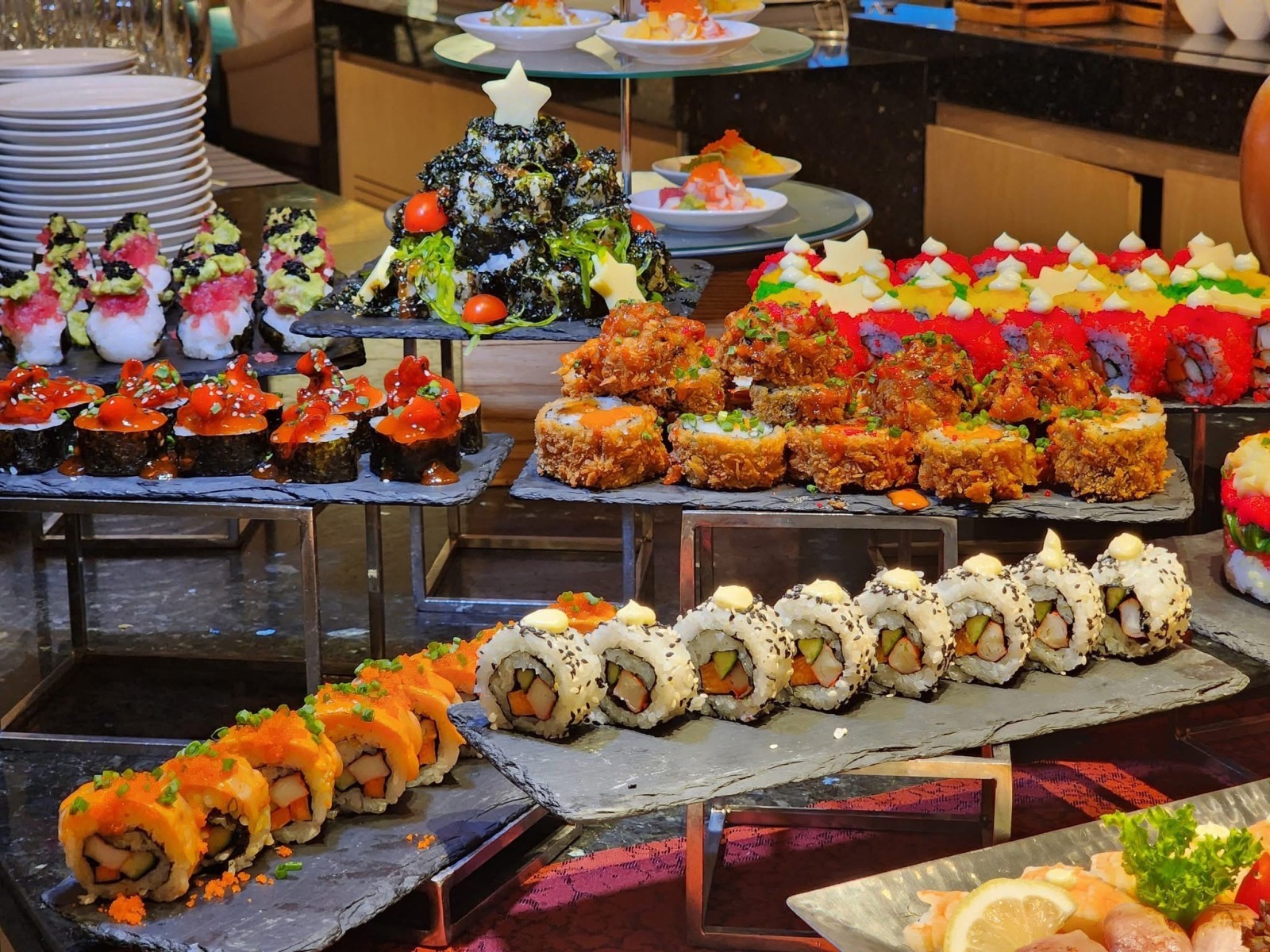 a culinary journey featuring a lavish spread of fresh seafood, meat, and global cuisines. From the carving station's juicy ribeye to the decadent chocolate fountain, there's something to satisfy every palate. Book Now
