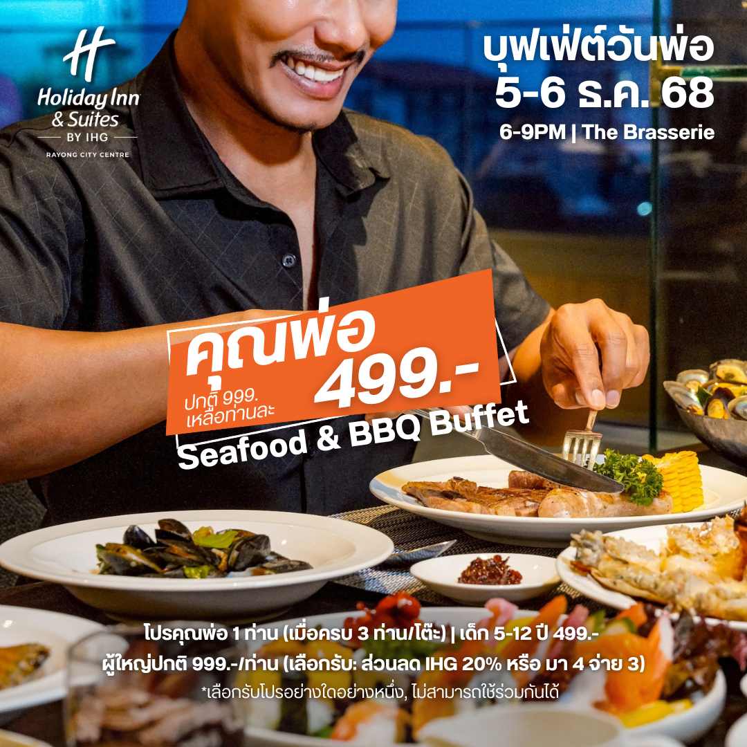 Celebrate Father's Day in Rayong with n exclusive dining experience special buffet dinner at The Brasserie enjoy premium seafood & meat Available Dec 5-6. or enjoy with family set at Elementi Rooftop Restaurant & Bar Available Dec 5-8. between Book now!