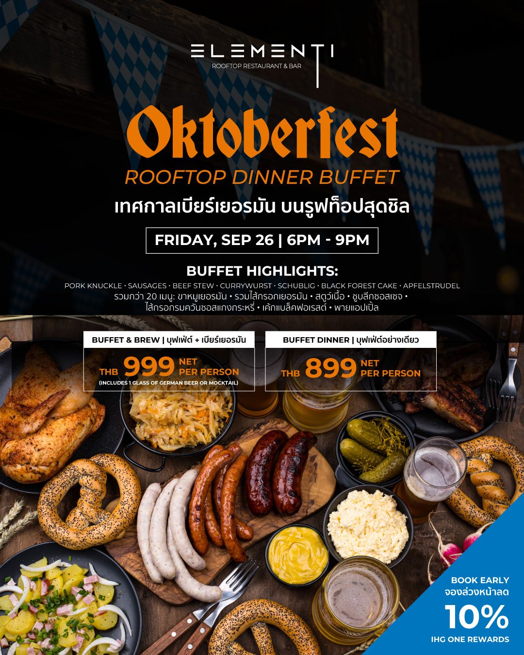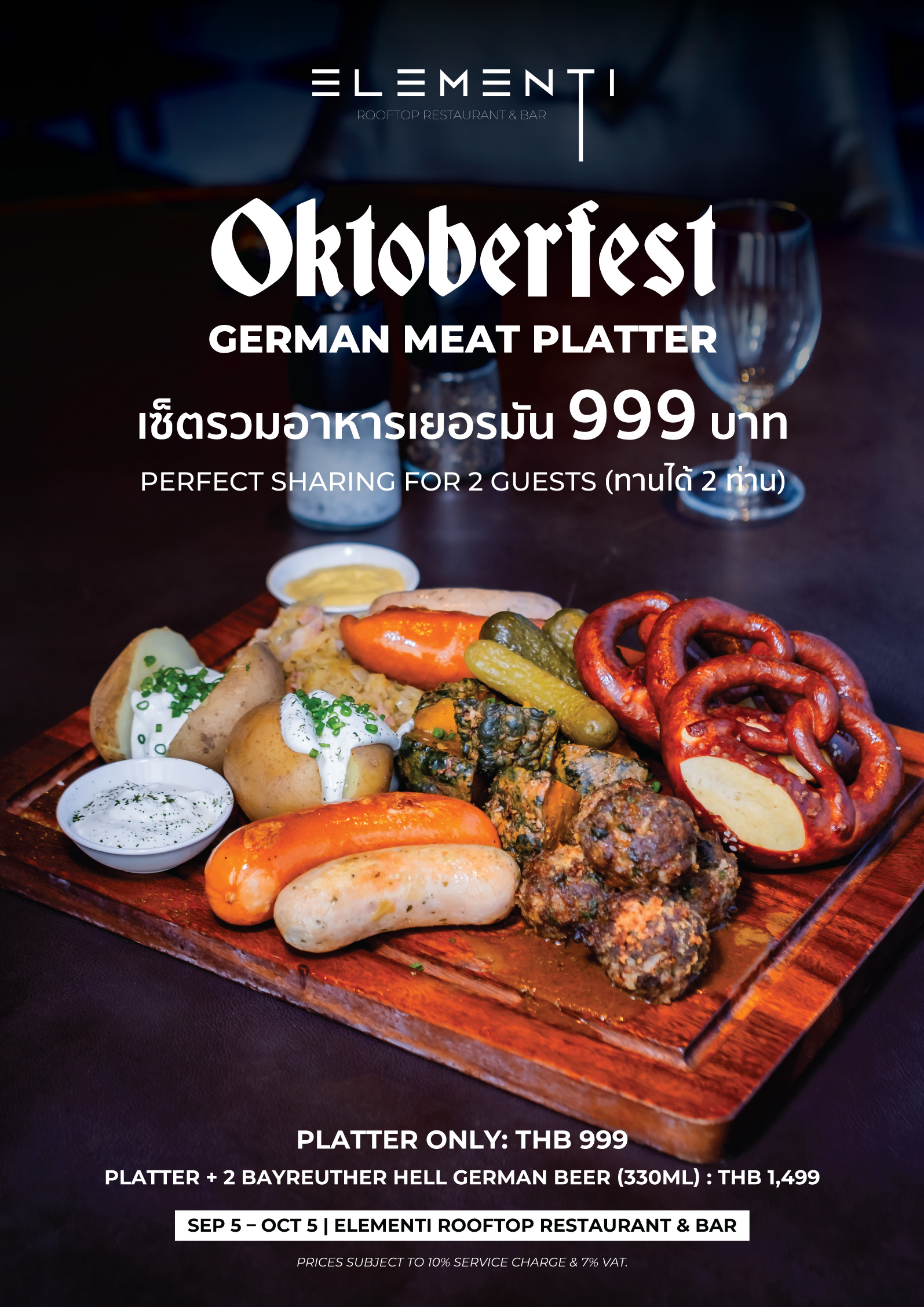 Celebrate Oktoberfest Buffet Dinner at Elementi Rooftop Restaurant on Friday 26th of September. German Meat Platter to Enjoy sausages, meatballs, pretzels, sauerkraut, roasted potatoes, and more. Perfect for 2 guests with optional German beer pairing. Available from 5 Sep – 5 Oct.