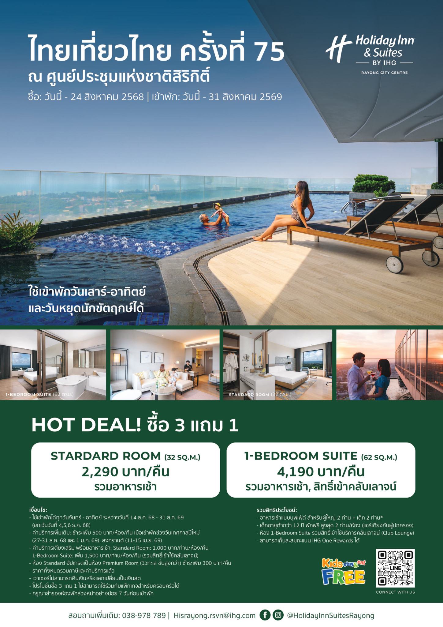 พักผ่อนระยอง ในราคาสุดคุ้มที่ Holiday Inn & Suites ระยอง กับโปรโมชั่นพิเศษ ไทยเที่ยวไทย ครั้งที่ 77 จองออนไลน์ 2 มี.ค. 69 - 11 มี.ค.69 โอกาสทองในการสัมผัสความสบายสุด Exclusive ใจกลางเมืองระยอง