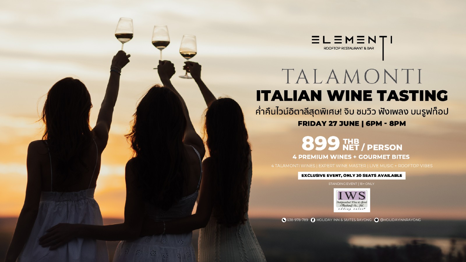 Rayong's Exclusive Italian Wine Tasting!(Limited to 30 Guests!) - Join us at Elementi Rooftop Bar for an unforgettable wine journey! Taste 4 exquisite wines from Talamonti, one of Italy's finest wineries. Buy Online