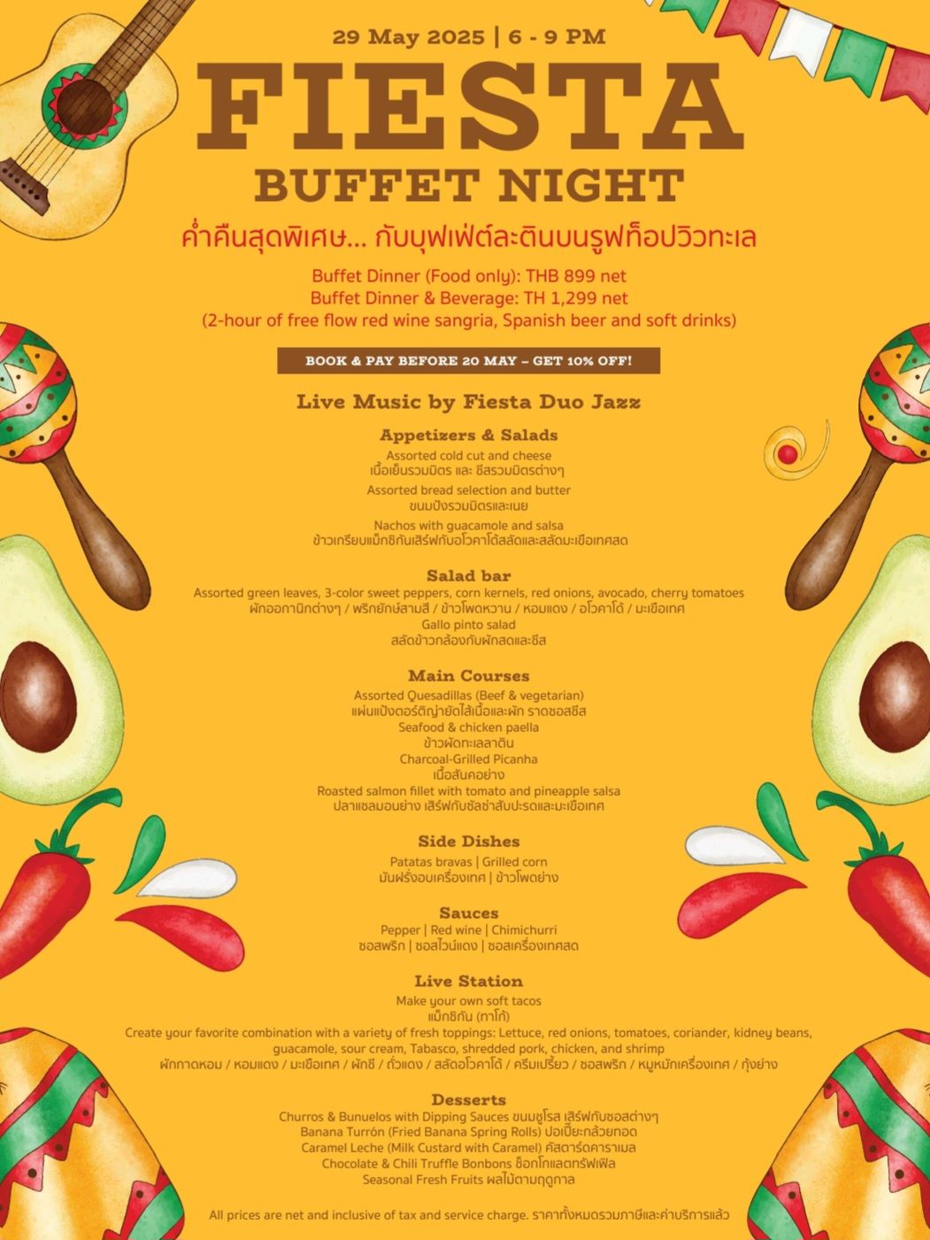 One Night Only! Fiesta Buffet Night at Elementi Rooftop Restaurant & Bar Get ready for an unforgettable rooftop dining experience at Holiday Inn & Suites Rayong on Thursday, May 29th, 2025. Celebrate the evening with your loved ones while enjoying breathtaking sunset views over the ocean and indulging in a premium selection of authentic cuisine crafted exclusively for this special night. Book Now