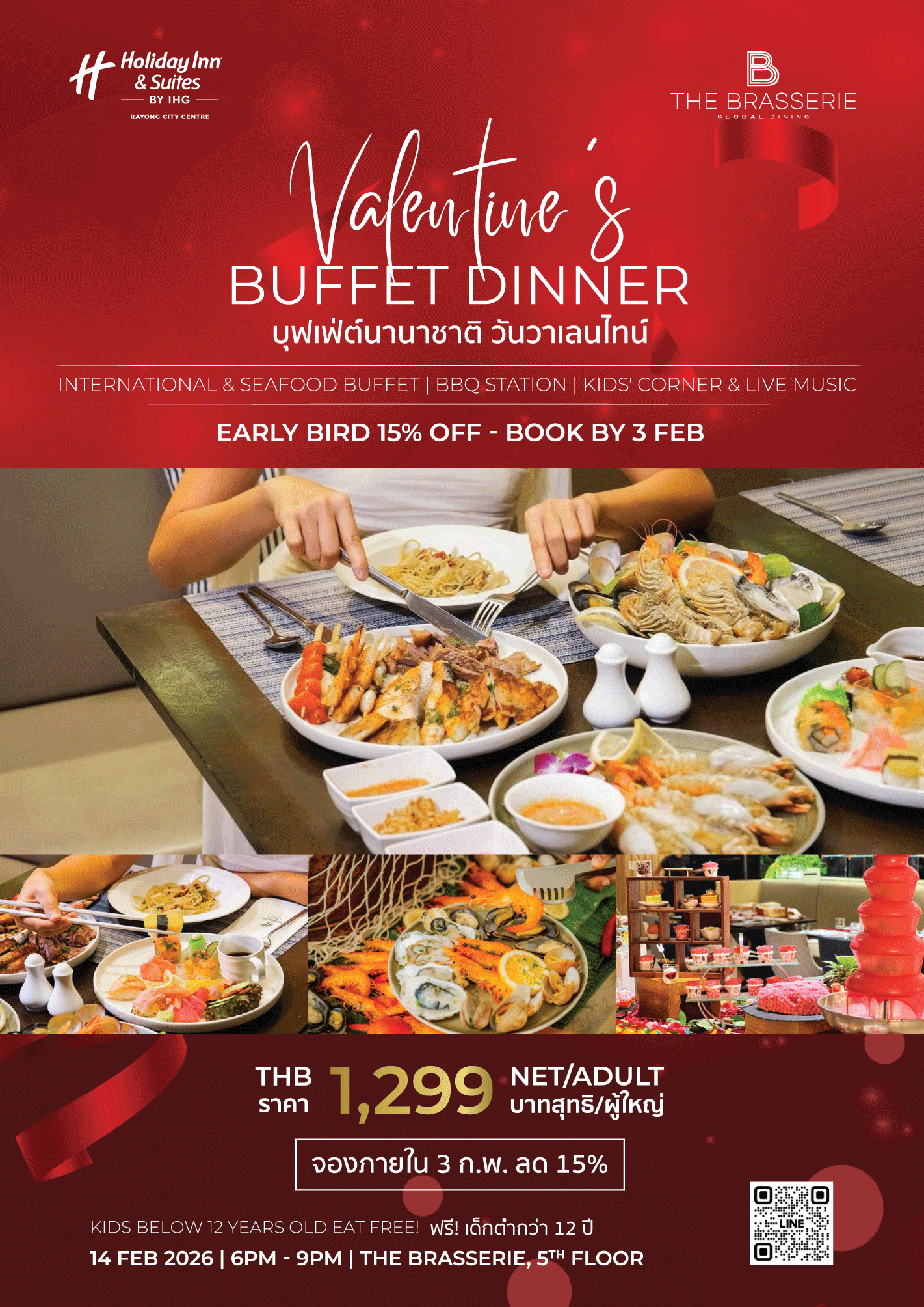 Mid-Week Buffet Dinner at The Brasserie, 5th Floor, Holiday Inn & Suites Rayong City Centre. Indulge in a delicious spread of comforting favorites, including authentic Thai dishes, pasta, pizza, sushi, and a fresh salad bar.