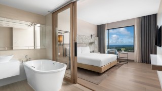 Located from 21st – 26th floor, Experience the allure of our spacious 72-square-meter one-bedroom corner suite, featuring a contemporary yet inviting living space – a perfect choice for those seeking ample accommodations with a touch of elegance. Our lavish suites are thoughtfully appointed with modern amenities, including a Bluetooth speaker, Smart TV, and a premium bathtub, ensuring a luxurious and comfortable stay. Stay seamlessly connected with unlimited high-speed Wi-Fi access and indulge in entertainment on the Smart TV. Additionally, relish the privilege of accessing the Executive Club Lounge, adding an extra layer of exclusivity to your stay.