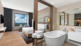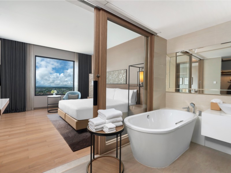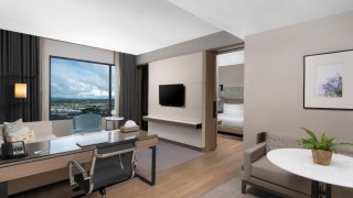 ห้องสวีท 2 ห้องนอน เหมาะสำหรับพาครอบครัว มาผ่อนคลายด้วยวิวทะเลและวิวภูเขา ขนาดห้องกว้างถึง 94 ตร.ม. บนชั้นสูงสุดของโรงแรม (ชั้น 27) ตกแต่งสไตล์ร่วมสมัย เหมาะสำหรับการพักผ่อนเป็นกลุ่มหรือครอบครัว พร้อมพื้นที่ใช้สอยกว้างขวาง มี 2 ห้องนอน ประกอบด้วยห้องเตียงเดี่ยวและห้องเตียงคู่ มีห้องนั่งเล่น ห้องน้ำส่วนตัวพร้อมอ่างอาบน้ำ พร้อมสิ่งอำนวยความสะดวกครบครัน อาทิ โต๊ะทำงาน WiFi ความเร็วสูง สมาร์ททีวี ลำโพงบลูทูธ ไมโครเวฟในห้องพัก